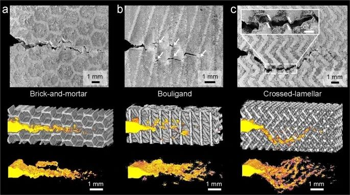 微觀取向不斷變化的特定空間構(gòu)型能夠誘導(dǎo)裂紋沿仿生結(jié)構(gòu)發(fā)生偏轉(zhuǎn),增大裂紋面的面積,并且凹凸不平的裂紋面之間能夠產(chǎn)生摩擦并形成橋連,有助于消耗外加機(jī)械能,實(shí)現(xiàn)高效增韌;