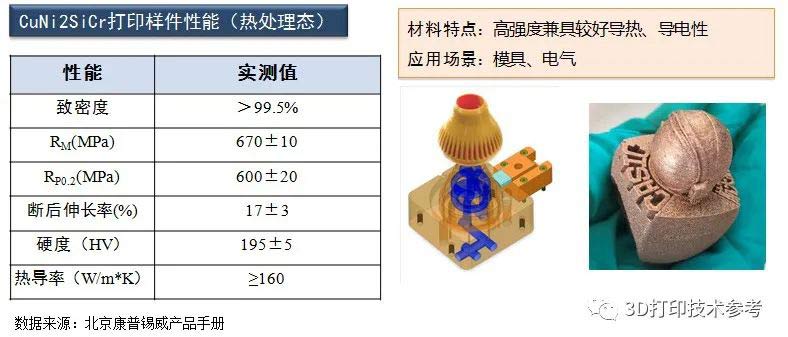 SLM Solutions公司于2019年推出CuNi2SiCr銅合金材料產(chǎn)品,該材料是一種可熱處理硬化合金,具有高強(qiáng)度以及電導(dǎo)率和導(dǎo)熱率的平衡組合,同時合金中包括鎳和硅成分,具有很高的耐腐蝕性和耐磨性。CuNi2SiCr本身不是一個新成分,該材料對應(yīng)美標(biāo)C18000合金,SLM Solutions公司率先將該材料用于增材制造并開展了材料鑒定和參數(shù)驗(yàn)證工作,為增材制造銅合金家族增加了一項(xiàng)重要成員。CuNi2SiCr熱處理后的強(qiáng)度明顯高于CuCrZr等材料,同時還能保持一定的導(dǎo)熱率和導(dǎo)電率,已經(jīng)能夠滿足部分模具制造要求和導(dǎo)電件要求,因此在模具和電氣領(lǐng)域?qū)⒂兄匾獞?yīng)用。